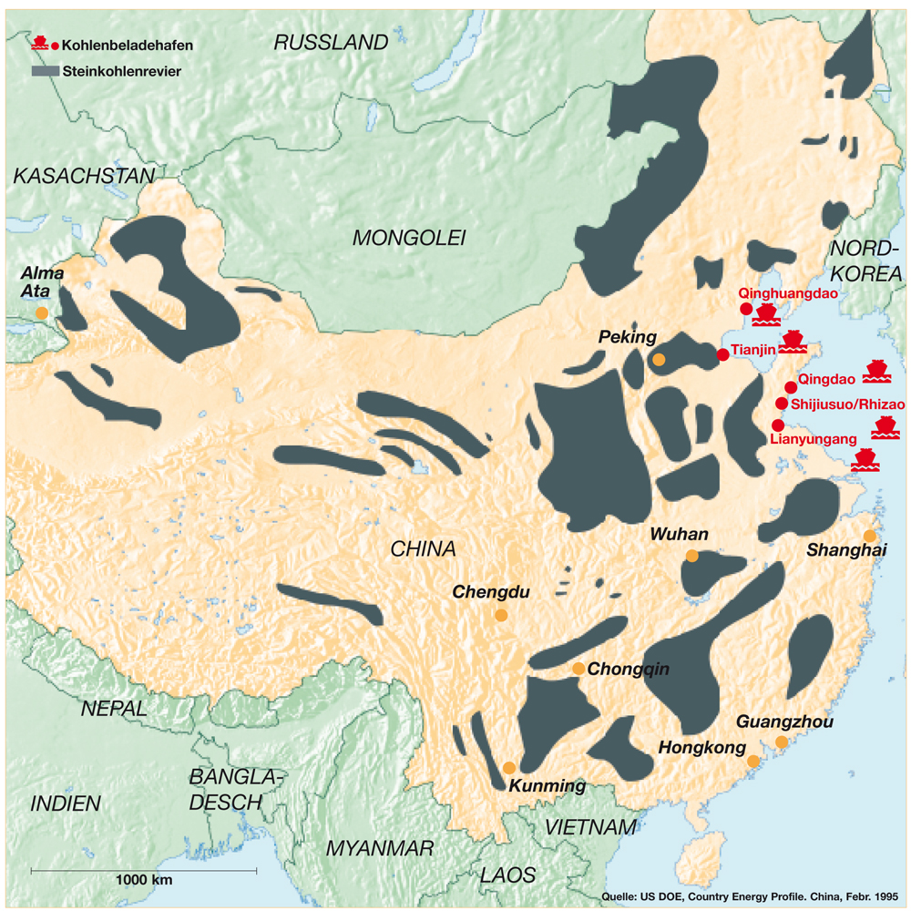 In den Kohlelagerstätten Chinas finden sich rund elf Prozent der Weltvorräte an Steinkohle.