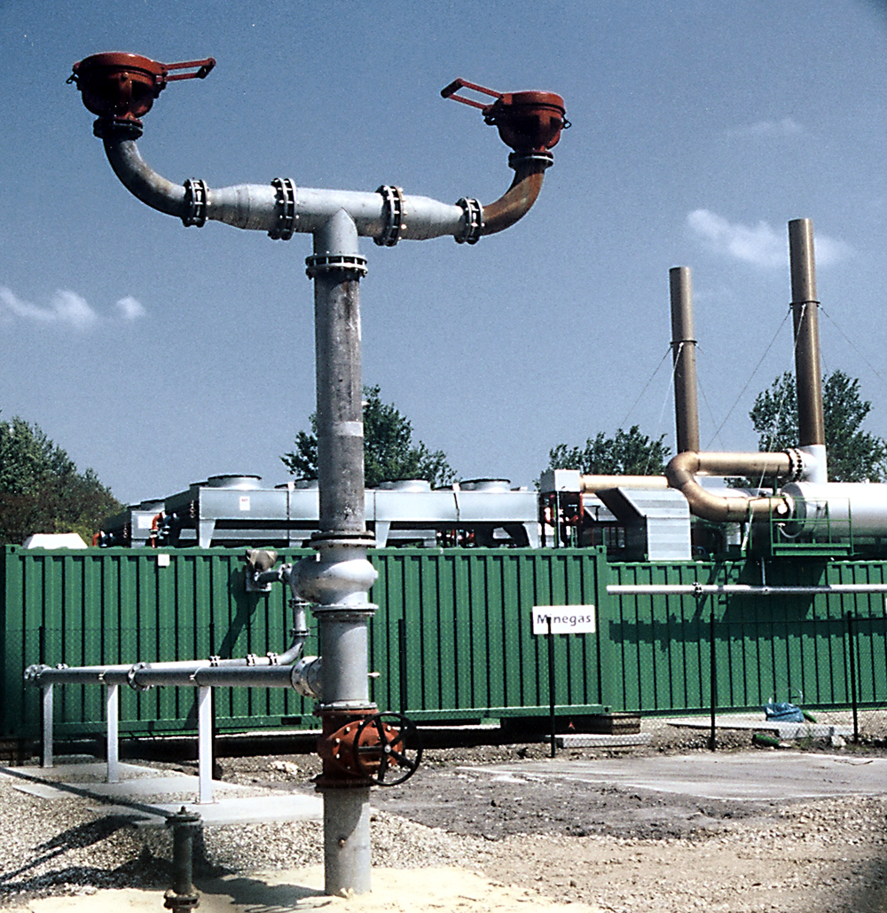 Das mit Grubengas betriebene Blockheizkraftwerk am Schacht Kurl-3 in Lünen. Im Vordergrund ist die "Protegohaube" zu sehen, die den Schacht abdeckt und vor Blitzeinschlägen schützt.