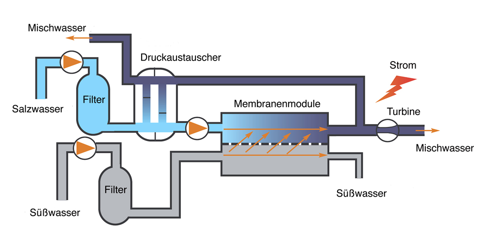 Prinzip eines oberirdischen Osmose-Kraftwerks: Süßwasser (grau) wird in die Anlage eingespeist, gefiltert und in die Membranenmodule weitergeleitet. Hier dringt 80 bis 90 Prozent des Süßwassers per Osmose durch die Membran in das ebenfalls gefilterte Salzwasser (hellblau) ein – der Wasserdruck nimmt zu. Ein Drittel dieses unter Druck stehenden Mischwassers (dunkelblau) wird zur Stromerzeugung an die Turbine weitergeleitet. Die übrigen zwei Drittel werden – um das günstigste Verhältnis von Druck und Wasserdurchfluss einzustellen – zu einem Druckaustauscher zurückgeleitet. Optimale Betriebsbedingungen werden bei einem Druck von 11 bis 15 bar erreicht. (Grafik: Statkraft)