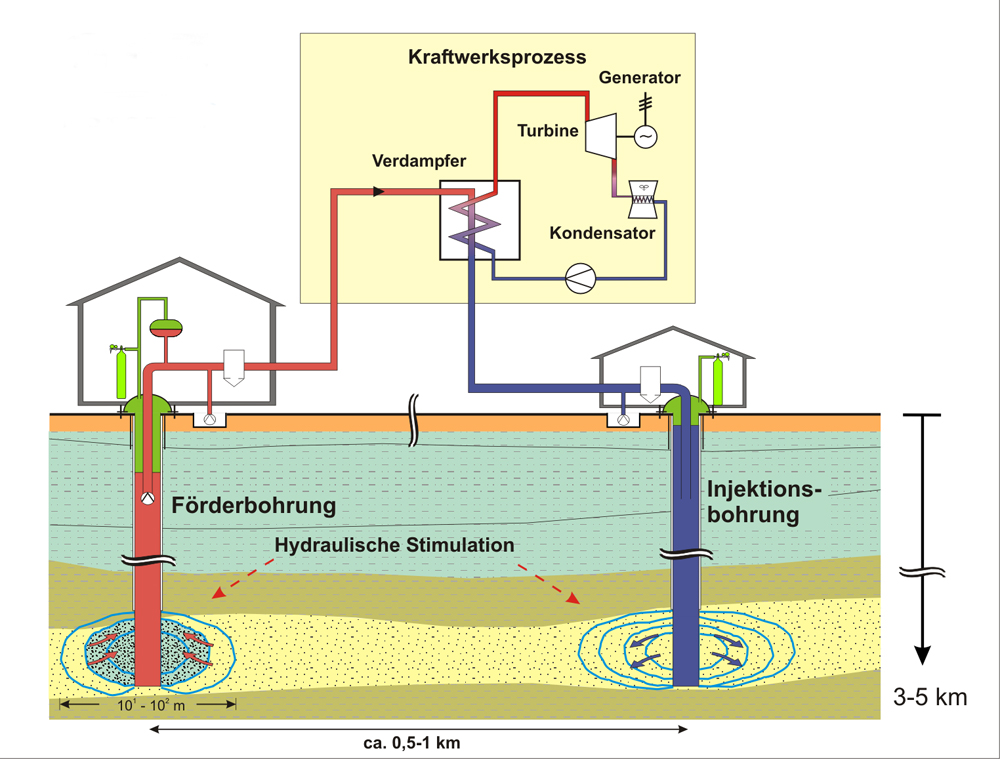 Das Prinzip geothermischer Stromerzeugung: Voraussetzung sind zwei Bohrungen, ein ergiebiger und andauernder Thermalwasserkreislauf und ein obertägiges Kraftwerk. Über die erste Bohrung wird das Wasser aus der Tiefe gefördert. Es gibt seine Wärme über einen Wärmetauscher an ein schon bei geringen Temperaturen siedendes Arbeitsmittel ab, das in einem Sekundärkreislauf einen Generator zur Stromerzeugung antreibt. Über die zweite Bohrung wird das Wasser wieder zurück in den Speicher geleitet .